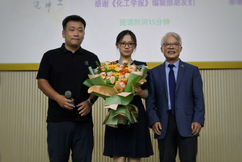 报告结束后,现场进入气氛热烈的开放提问环节。新生们积极举手,就“化工青年如何规划自身成长”“如何培养科研思维”等关切的问题与朱院士互动交流。每当朱院士做出精辟解答时,台下便有阵阵会意的点头和激烈的掌声。随后,2025级新生代表贾悦桐向朱世平院士献花致敬,全体师生代表与嘉宾合影留念。
