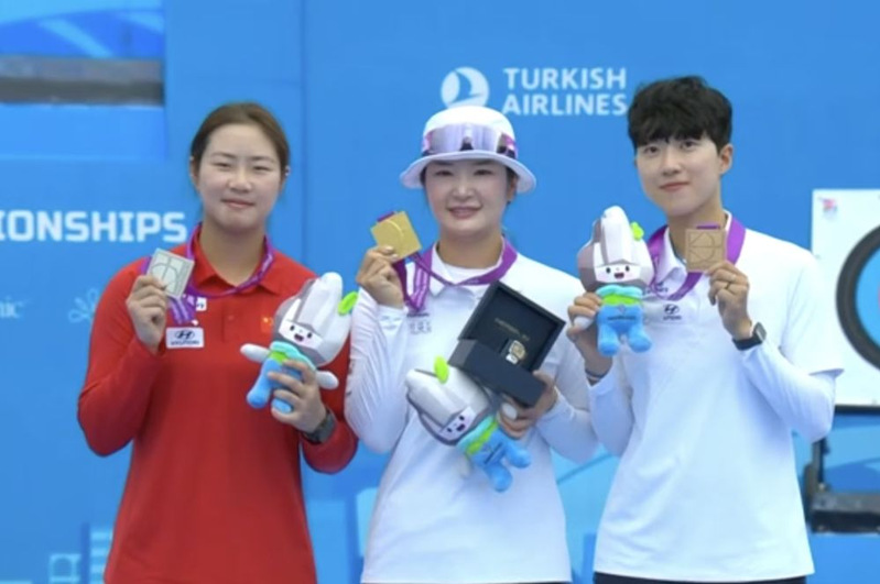 图片说明:亚军朱静怡(左)、冠军韩国选手姜彩荣和季军韩国选手安山(右)