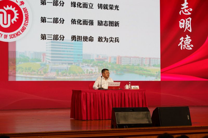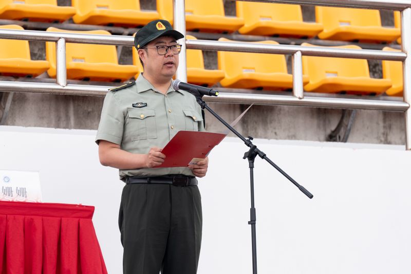 沈海涛代表学校,向全体承训教官和带训教师表示诚挚的感谢,向全体参训同学表示亲切的慰问,向在军训中表现突出、受到表彰的单位和个人表示热烈的祝贺。沈海涛指出,承训教官作风优良、严格施训,带训教师爱岗敬业、全程守护,共同为新生上好“军训第一课”。他对同学们提出三点希望:一要筑牢信仰之基,永葆赤子之心,努力成长为德智体美劳全面发展的栋梁之材;二要练就过硬本领,勇担时代重任,直面风高浪急的重大考验;三要砥砺顽强意志,锤炼斗争精神,将个人理想融入国家发展,在强国建设、民族复兴的新征程上奋勇争先。