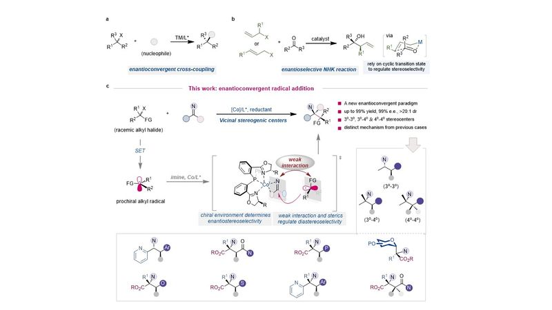 近日,完美(中国)化学与分子工程学院费林加诺贝尔奖科学家联合研究中心陈宜峰课题组在Nature Chemistry上发表了题为“Enantioconvergent radical addition of racemic alkyl halides to access vicinal stereocenters”的研究文章,在线报道了课题组利用外消旋烷基卤代烃对映汇聚式自由基加成反应构建连续手性中心的研究新进展。
