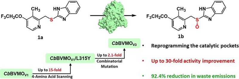 手性亚砜药物是治疗胃食管反流及溃疡类疾病的重要药物,其中右旋兰索拉唑具有疗效显著且副作用小的优点。然而,其传统化学合成需大量使用过渡金属催化及有机过氧化剂,且过氧化副产物难以控制,最终导致生产工艺复杂,生产成本高和环境负荷重等问题。针对这一瓶颈,研究团队以来源于Cupriavidus basilensis的Baeyer–Villiger单加氧酶为研究对象,采用“四氨基酸扫描”策略对酶催化口袋进行系统重编程。研究发现,L315Y突变通过与邻近残基R312形成新的π–π相互作用网络,有效稳定了反应过渡态,最终获得的突变体酶CbBVMOV3催化效率提升逾30倍。与传统化学过渡金属催化合成工艺相比,酶催化工艺废物排放量减少92.4%,生产成本降低80%,时空产率提高15倍。