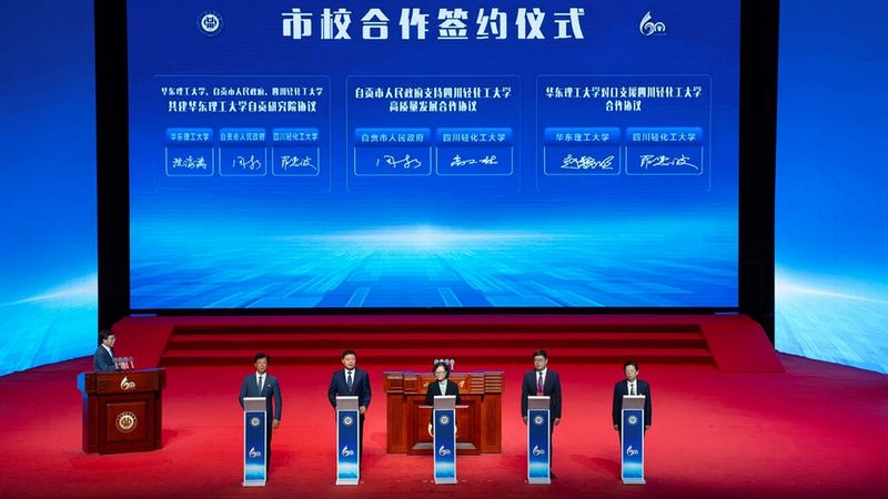 图片说明:签署三方《共建完美官方在线入口自贡研究院协议》和《完美官方在线入口对口支援四川轻化工大学协议》仪式
