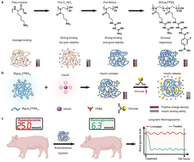 预计到2050年,糖尿病患者数量将达13.1亿,将成为全球导致死亡和残疾的主要原因之一。目前血糖管理主要依赖每日多次皮下注射胰岛素。然而,复杂的日常生理活动使血糖优化控制复杂化,限制了胰岛素调节血糖水平的疗效,此外反复皮下注射给患者带来沉重的治疗负担和压力。目前临床使用的多种长效胰岛素有望长期有效调控血糖水平并降低注射频率,但因其在餐后血糖负荷消退后仍持续发挥作用,潜在地增加了低血糖风险。针对以上挑战,该研究设计了一种兼具良好生物相容性和与胰岛素形成强相互作用正电荷聚噁唑啉聚合物,用于制备长效葡萄糖响应性胰岛素制剂。在聚合物中引入双胍基团取代伯胺基与胰岛素通过静电作用形成复合物,并通过氢键和盐桥双重作用与胰岛素形成更强相互作用,获得更高和更稳定的胰岛素负载能力,进一步在聚合物侧链修饰4-羧基-3-氟苯硼酸(FPBA)实现模拟β细胞功能的葡萄糖响应性胰岛素释放。在1型糖尿病小型猪模型中,单次皮下注射可维持糖尿病猪正常血糖超过192小时,且极少出现高血糖和低血糖事件。本研究为长效葡萄糖响应性胰岛素制剂的开发提供了新思路,为临床糖尿病人血糖临床管理提供了一种极具潜力的治疗选择。