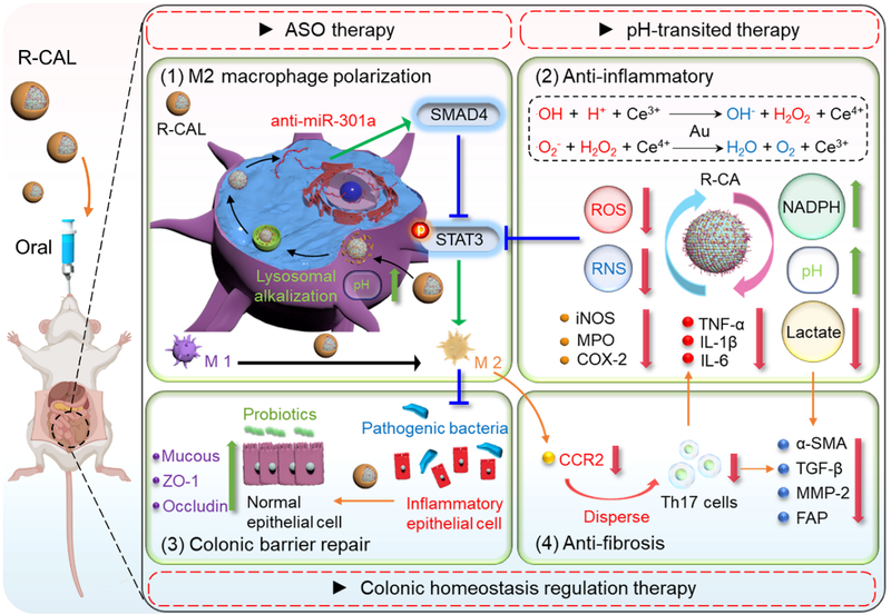 图片说明:口服金缀合的铈基纳米递药平台装载anti-miR-301a治疗炎症性肠病的机制示意图