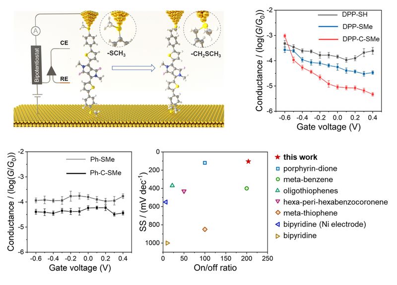 本研究以二酮吡咯并吡咯(DPP)为核心,构建了一系列供体-受体-供体(D-A-D)型窄带隙分子导线,并通过锚定基团工程实现了从强耦合(DPP-SH)、中等耦合(DPP-SMe)到弱耦合(DPP-C-SMe、DPP-C2-SMe)的系统调控。实验表明,引入亚甲基间隔的DPP-C-SMe分子在电化学栅控下表现出卓越性能:在1.0 V的栅压窗口内,其开关比高达204倍,亚阈值摆幅低至105 mV/dec,进一步接近室温下传统半导体器件的理论极限(60 mV/dec)。研究团队通过扫描隧道显微镜裂结技术、量子输运模拟及电化学表征手段,揭示了性能提升的微观机制:亚甲基间隔有效削弱了分子与电极的电子耦合,保留了分子本征的能级排列;而窄带隙结构则使分子在栅压调控下易于进入近共振输运区域,从而实现高效的栅控调制。