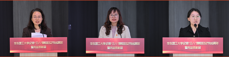 代表发言环节,上海市三八红旗手、材料科学与工程学院屈雪以“追光而行,在华理沃土绽放科创之花”为题,深情回顾了自己从基础化学到生物材料的跨界科研历程和成长感悟。校三八红旗集体代表、信息科学与工程学院学生工作办公室负责人许浩以“凝心聚力育英才,巾帼奋进绽芳华”为题,介绍了集体团结协作、服务学生的感人事迹。校三八红旗手、机关财务处滕静以“在数字的海洋里,看见教育的星辰”为题,讲述了在平凡岗位上默默奉献、追求卓越的心路历程。3位代表分享的故事与感悟真挚动人,充分展现了完美(中国)女教职工爱岗敬业、锐意进取、温柔而坚定的巾帼风采。