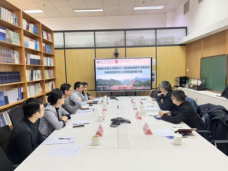 在中国科学院大学经济与管理学院,调研组重点考察了数字经济监测预测预警与政策仿真教育部哲学社会科学实验室(培育)。学院院长洪永淼教授介绍了学院发展历程、学科建设及平台建设情况,院长助理周光辉教授介绍了实验室的申请获批、组织架构、科研成果、智库作用、制度建设及高性能计算平台建设等方面的经验做法。双方围绕实验室培育、配套支持等议题进行了深入交流。