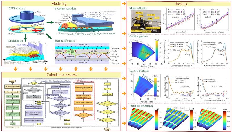高速涡轮机械正朝着高功率密度、无油化方向发展,气体箔片推力轴承作为核心支承部件,其工作过程涉及气膜压力、结构变形与温度场三者之间的复杂相互作用。过去的研究在处理波箔结构时,大多将其简化为弹簧模型,或者忽略温度变化带来的影响。这使得在高转速工况下,难以准确预测箔片受热后的变形情况,以及这种变形对轴承承载能力的影响,制约了轴承在实际应用中的可靠性。针对这一问题,研究团队建立了一个同时考虑结构热变形和摩擦接触的计算模型。该模型引入了接触热阻和粘滞-滑移摩擦算法,能够协同计算波箔的力学变形和热量传导过程,并在保证计算精度的前提下提高了计算效率。这一方法突破了传统模型忽略波箔热变形的局限,能够更准确地预测超高转速下轴承的临界转速和承载能力。