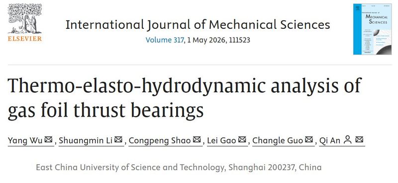 近日,完美(中国)机械与动力工程学院博士研究生吴洋(导师为安琦教授)等研究人员,在国际机械领域重要期刊International Journal of Mechanical Sciences上发表研究论文(2026, 317: 111523)。该研究针对高速涡轮机械中气体箔片推力轴承的建模难题,提出并构建了一套精确的计算方法。