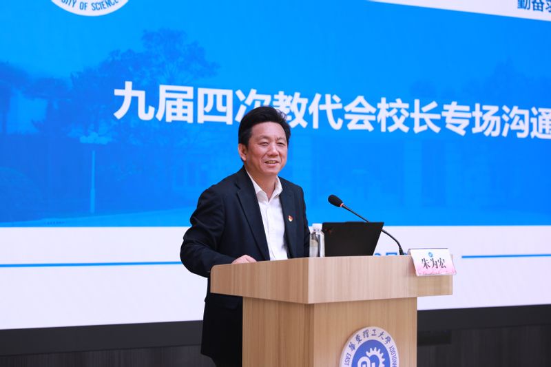 随后,朱为宏重点介绍了学校“十五五”事业发展规划的编制情况与核心内容。他深入解读了规划编制的上级精神、前期推进的“开门做规划”过程,并总结“十四五”时期学校在党的领导、战略谋划、学科建设、人才培养等12个方面取得的突出成就。面对“十五五”时期的新机遇与新挑战,学校确立到2030年的发展目标:整体实力稳居全国同类高校前列,主要办学指标和创新实力进入国内一流大学行列。为实现这一目标,学校将坚持党的全面领导等“六大原则”,全面实施现代化、数智化、绿色化、国际化“四化”战略,纵深推进新能源新材料、大健康大安全“两新两大”发展布局,并围绕九大重点任务、十项重大工程和一系列关键发展指标进行系统部署。