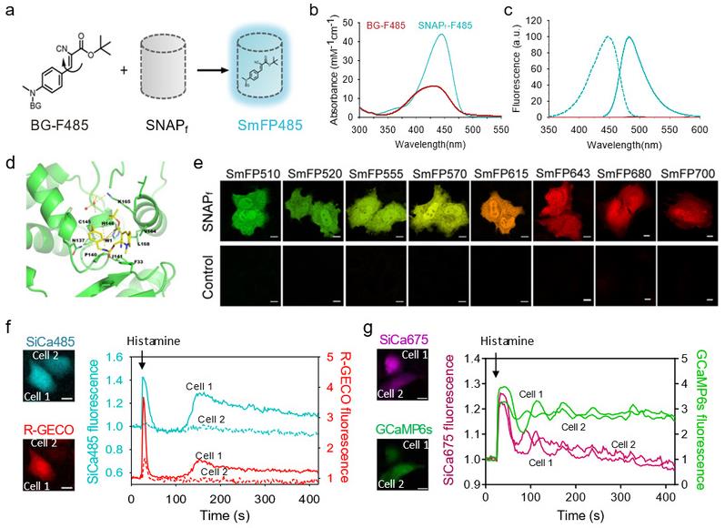 Recently, the research team of Yang Yi/Zhu Linyong/Chen Xianjun from the School of Pharmacy, the State Key Laboratory of Bioreactor Engineering, and the Interdisciplinary Research Center of optogenetics and Synthetic Biology, ECUST, made important progress in the study of protein labeling and imaging of living cells, and published a research article entitled “Design of a palette of SNAP-tag mimics of fluorescent proteinsand their use as cell reporters” in Cell Discovery.
